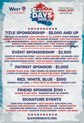 Elkhorn Days is our annual celebration of the city that includes our parade, fireworks, Corn Hole Tournament, the TahaZouka Music Festival, the West O Car Show and much more! This is an amazing community event, but it can't happen without your support! Please sponsor in any way and feel free to email trevor@westochamber.org or call 402-578-2703 if you have any questions! We look forward to seeing you at Elkhorn Days!